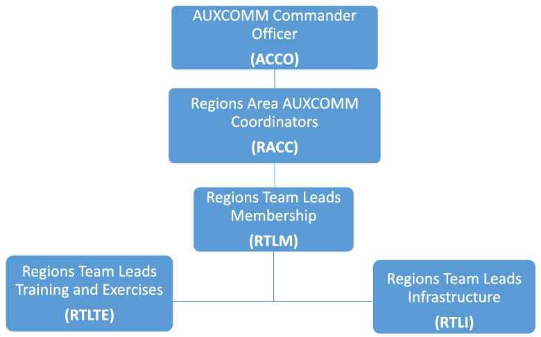 Each Region has a Region AUXCOMM Coordinator (RAC) to help manage dailyN operations. In addition, the ACCO and RAC may appoint Team Leads and project manager to address specific task required by the Region team.